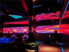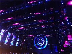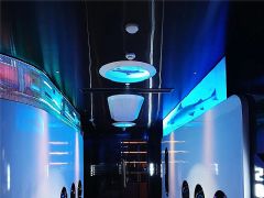 在1000㎡超大酒吧主厅,21m高空无立柱的全景空间内,联建光电主要采用超轻超薄、高通透、高亮的透明屏,打造360度全景视觉。