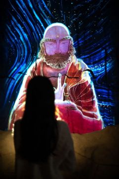 “一苇渡”是一场沉浸式东方美学视觉盛宴。在艺术内容创作上,沉浸式光影故事的核心定位在达摩与长江的关系上,以“渡”为主题切入点,形成“渡人”“渡己”“渡江”三个内容层次。具象成三个影片画面篇章:“达摩东来”“梁武辨佛”“一苇渡江”,近60分钟气势恢宏的视觉画面中,既有传统六朝美学色彩艳丽的呈现、又有现代线条变换的赛博朋克风、更有松绿、群青、嫣红、青冥、石蜜、檎丹、茈藐等多种中国传统色多角度多层次使用,从美学和艺术角度集中向游客展示一个充满东方美学的光影艺术空间。