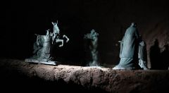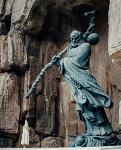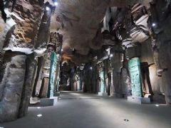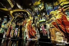 一苇渡达摩石窟光影艺术馆户外广场日间项目文旅载体为2016年幕府山矿坑修复期,由孙家彬教授设计百余尊形态各异的达摩塑像,恢复重建的禅宗文化主题“百态达摩”石窟。2023年,依托此文旅场景上下两层1786平方米空间,由众多艺术家共同创作,一层演绎区和互动区、二层探索空间的沉浸式游览线路设置,以通俗易懂的光影语言呈现“百变达摩”,再现“一苇渡江”、“达摩东来”、“梁武辩佛”等传奇故事。